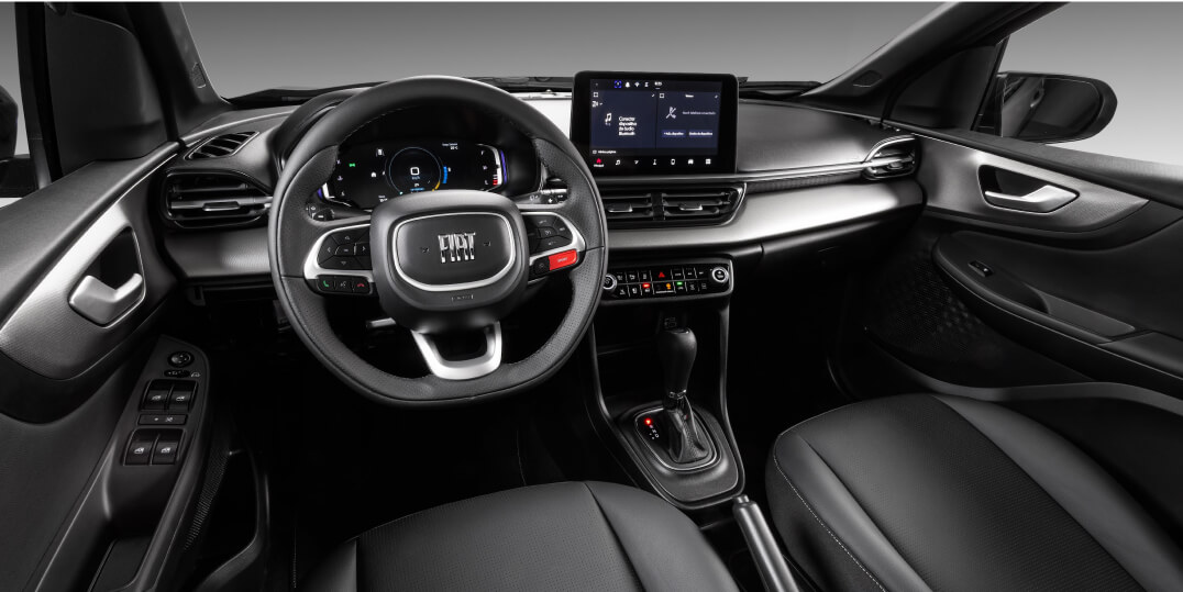Fiat Pulse tiene un diseño interior lineal y apasionante, lo cual se percibe con solo verlo: una consola central revestida de cromo satinado y un panel texturizado con terminaciones que hacen brillar los ojos, los cuales están también presentes en las puertas.